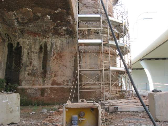 Una volta rimossi tutti i conci della pila si è intervenuti con le carotatici andando a realizzare fori 36mm e 80mm sia in parete che sulla parte semisferica orizzontale. Sono stati quindi posate barre in tondo liscio FE 510 M 30 (filettate ad entrambe le estremità per una lunghezza di 140mm) e barre in acciaio FE b 44 K ad aderenza migliorata, sigillate con Emaco S 55. Nelle parti inferiori delle pile sono stati inoltre eseguite sfiorettature a raggio su diversi ordini disposti in altezza, nei fori sono state poi posate barre in acciaio Fe b 44 K ad aderenza migliorata precedentemente zincate a caldo sigillate con boiacca cementizia fino al rifiuto.